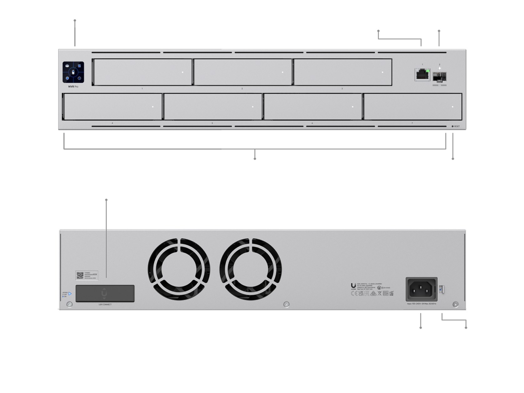 Питание на Network Video Recorder Pro подаётся встроенным блоком питания из сети переменного тока мощностью 200 Вт. На диски может подаваться до 135 Вт мощности. Полное потребление видеорегистратора — 160 Вт. Резервирование питания можно обеспечить с помощью UniFi USP-RPS (приобретается отдельно) через встроенный интерфейс USP RPS.