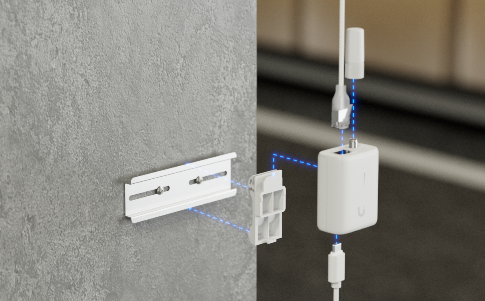 Device Bridge IoT — компактное устройство для промышленной среды, которое подключает любые Ethernet-приборы к Wi-Fi сети UniFi 2,4 ГГц. Оно поддерживает питание через USB-C или DC 9–30 В, монтируется на DIN-рейку и при необходимости позволяет установить внешнюю антенну для более уверенного сигнала.