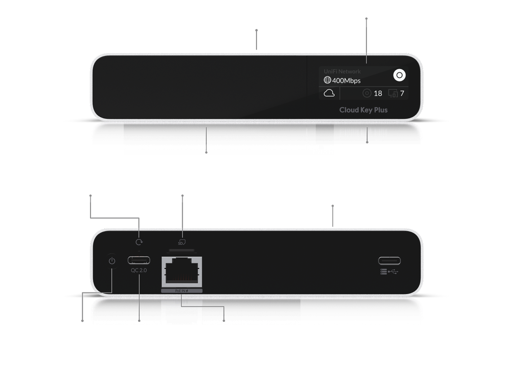 Cloud Key Gen2 Plus питается по технологии PoE или через порт USB-C (QC 2.0/3.0), имеет 1 GbE RJ45 сетевой порт и оснащён OLED-дисплеем для отображения системной информации и состояния. Корпус выполнен из анодированного алюминия в компактном настольном форм-факторе.